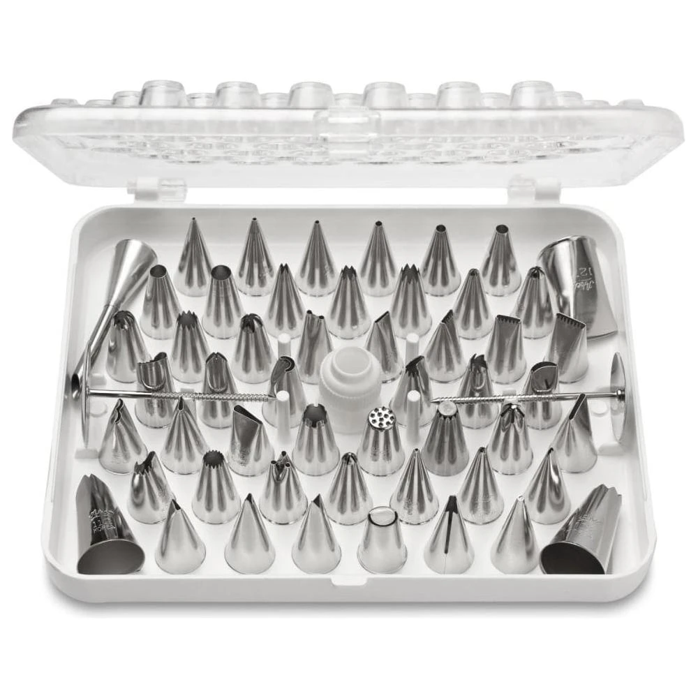 This Ateco professional 55 piece piping nozzle icing tube/ tip box set comes in a handy carry case.