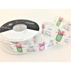 The design itself is great features a classic white satin ribbon with light blue and pink lettering, as well as a gorgeous floral design that makes this ribbon truly unique.