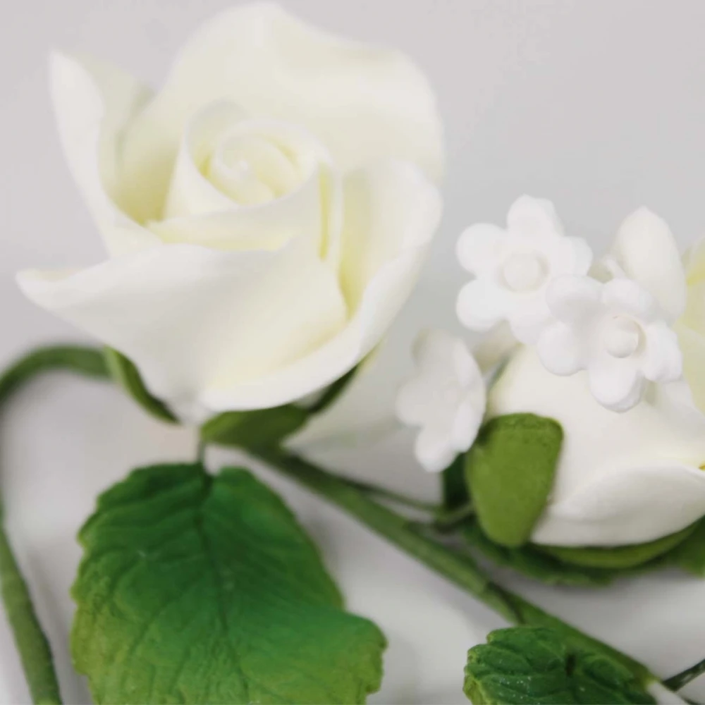 Featuring ivory Roses with leaves and a Forget-Me-Not trail, this flower spray is perfect for giving your cakes an elegant and professional finishing touch.