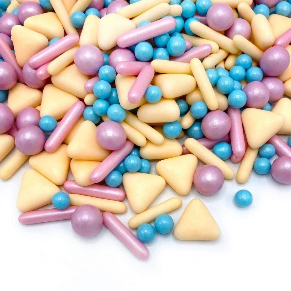 This sprinkle mix is the perfect combination of muted tones and pearlescent shimmer. Featuring pastel peach triangles, pearlescent pink rods, purple Choco balls and blue pearls, these sprinkles are great for bakes in need of a splash of colour.