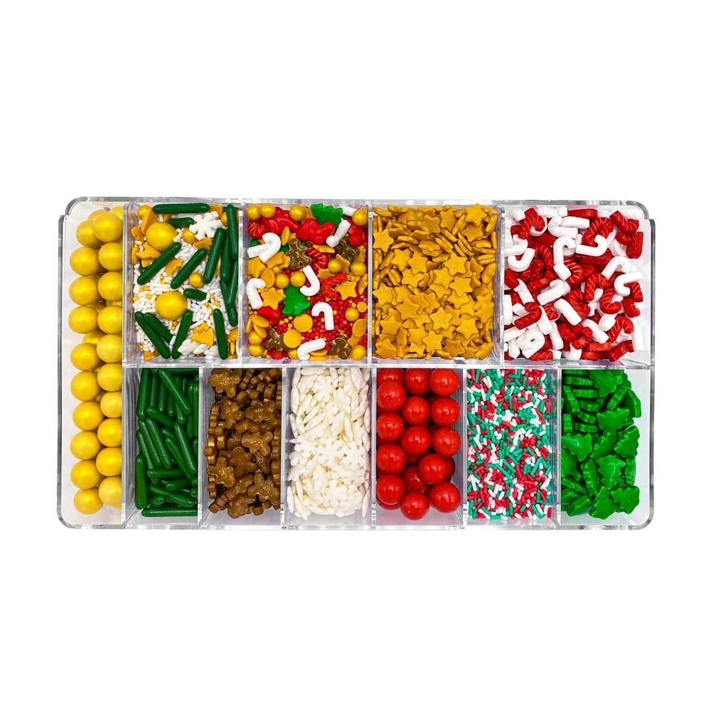 The Santa’s Elves Selection box includes 11 separate compartments, containing a variety of sprinkle mixes with fabulous festive vibes. The box includes: Candy Canes, Golden Stars, Christmas Trees, Gingerbread Men, White Snowflakes, Red and Gold Choco Pearls, Green Rods, and the mixes ‘Sleigh Ride’, ‘Santa’s Favourite’ and ‘Christmas Strands’ in white, red and green.