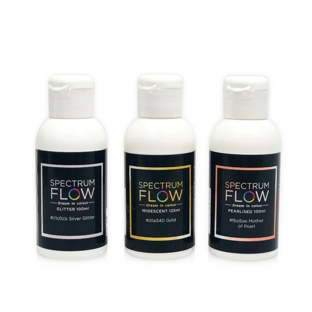 Spectrum Flow airbrush paints produce crisp, clean finishes on large areas of various edible mediums. All the paints in this kit are suitable for: sugarpaste, modelling paste, flower paste, buttercream, ganache, royal icing, chocolate, candy, marzipan, biscuits, ice-cream, wafer paper and so much more.