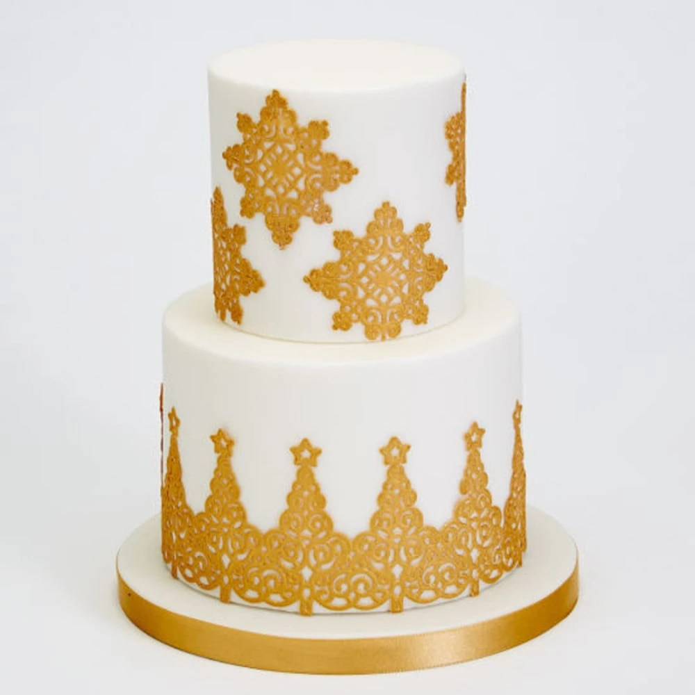With the Gold Flexi-Ice Mix by Squires Kitchen, you can create a huge range of exquisite lace designs to decorate the tops and tiers of your cakes.