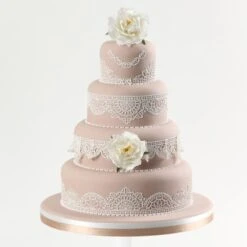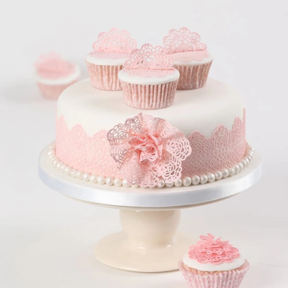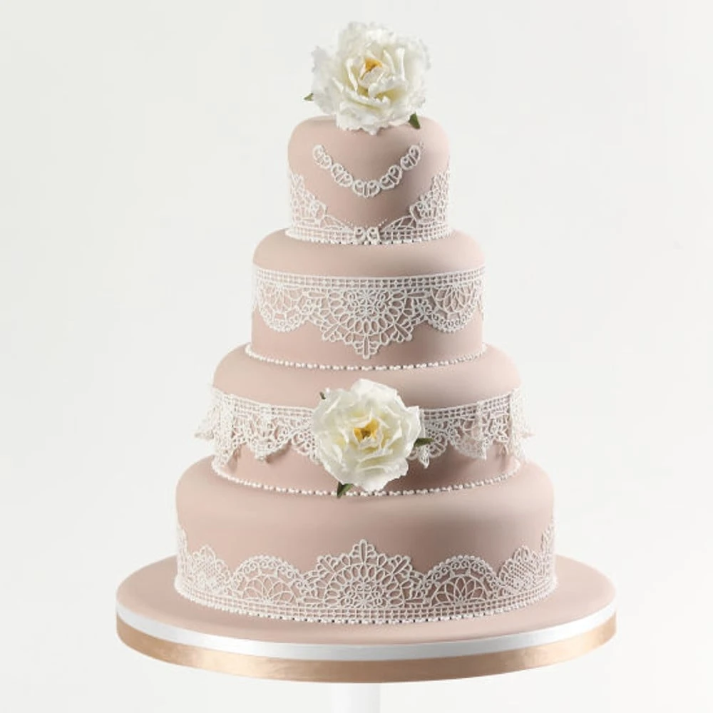 With the Ivory Flexi-Ice Mix by Squires Kitchen, you can create a huge range of exquisite lace designs to decorate the tops and tiers of your cakes.