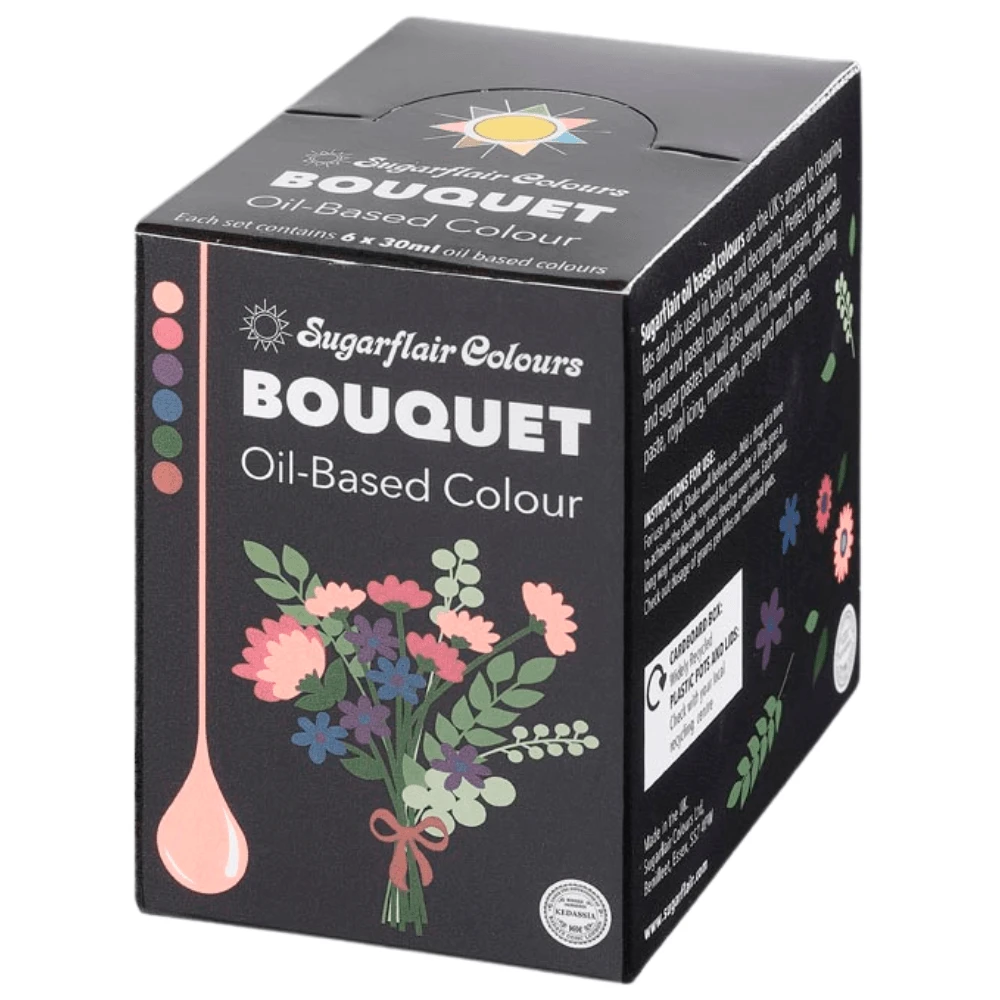 Add vibrant pops of colour to your cakes and decorations using Sugarflair’s Bouquet Set Of 6 oil based food colourings.