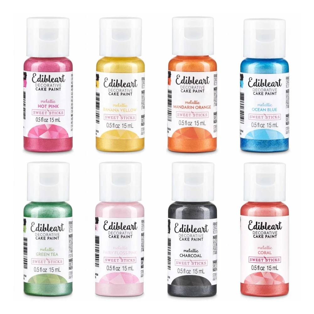 These revolutionary metallic art paints by Sweet Sticks are the first of their kind, designed to enhance the finer details in cake and cookie decorating. These paints take away the need to mix lustre and alcohol together that makes one big mess most of the time – and costs more money! With edible art paint, simply shake, pour and paint!