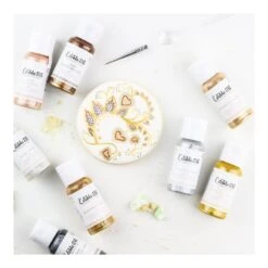 These art paints provide a beautiful metallic finish once dried, providing your projects with some extra glitz and glamour – perfect for using on various mediums including: sugarpaste and fondant, modelling paste, flower paste, marzipan, royal icing, macarons, chilled buttercream, sugar cookies, marshmallows, gold leaf, chocolate, ganache and even fruit!