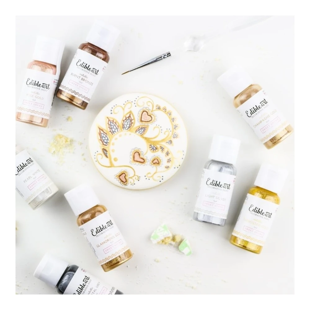 These art paints provide a beautiful metallic finish once dried, providing your projects with some extra glitz and glamour – perfect for using on various mediums including: sugarpaste and fondant, modelling paste, flower paste, marzipan, royal icing, macarons, chilled buttercream, sugar cookies, marshmallows, gold leaf, chocolate, ganache and even fruit!